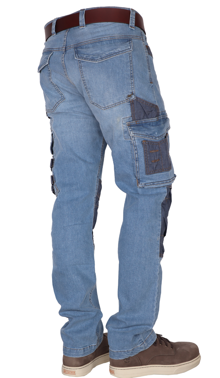 Multipocket spijkerbroek met Kniezakken, hamerlus en diverse handige zakken afsluitbaar met klep , duimstok zak en telefoon zakje uitgevoerd in Cordura.
