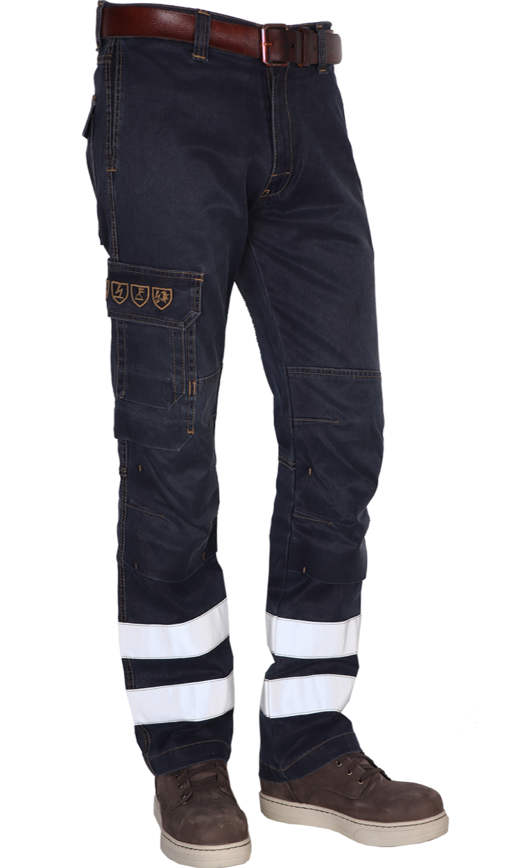 Brandvertragende, antistatische stretch jeans met lasnorm, vlamboog en reflecterende striping.